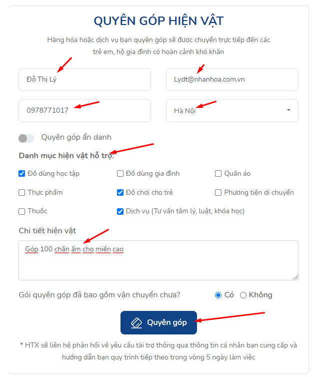 Điền đầy đủ thông tin theo form + ghi chú số lượng hiện vật nếu có > Khai báo xong ấn nút Quyên góp