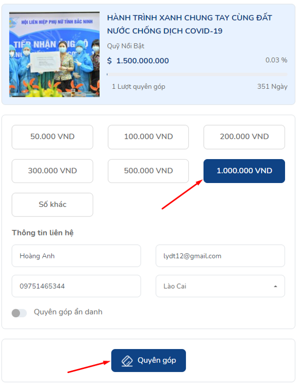 Các nhà hảo tâm vui lòng chọn mệnh giá quyên góp + điền đầy đủ các thông tin theo form và nhấn nút Khuyên góp.